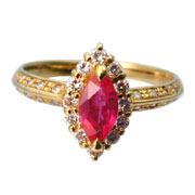 アンティークな雰囲気の中にマーキス形の明るいルビーが愛らしさを表しています。